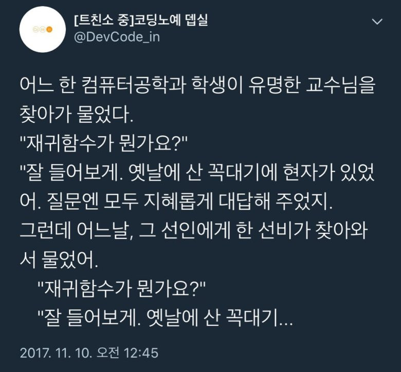 재귀 함수(recursive fuction)은 함수의 정의에서 자기 자신을 호출하는 형태의 함수입니다.