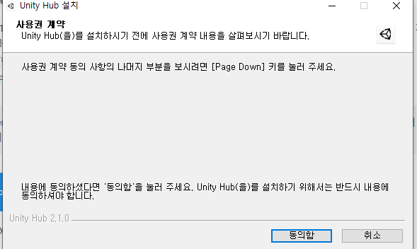 약관을 확인하고 체크 박스에 체크한 후 운영체제용 설치 프로그램 다운로드 버튼을 클릭하면 설치 프로그램을 내려받기 시작합니다. 내려받은 설치 프로그램을 실행하여 '유니티 허브'를 설치하면 유니티 허브에서 유니티의 대표적인 버전들을 내려받을 수 있습니다.