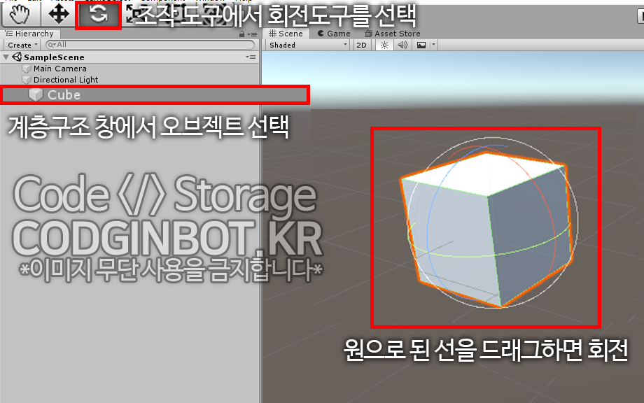 오브젝트 회전은 회전도구를 사용합니다. 조작 도구에서 회전도구를 선택하고 계층구조 창에서 Cube를 선택하면 정육 면체 위에 구 모양으로 커서가 생깁니다. 이때 원을 드래그하여 회전시킬 수 있습니다.