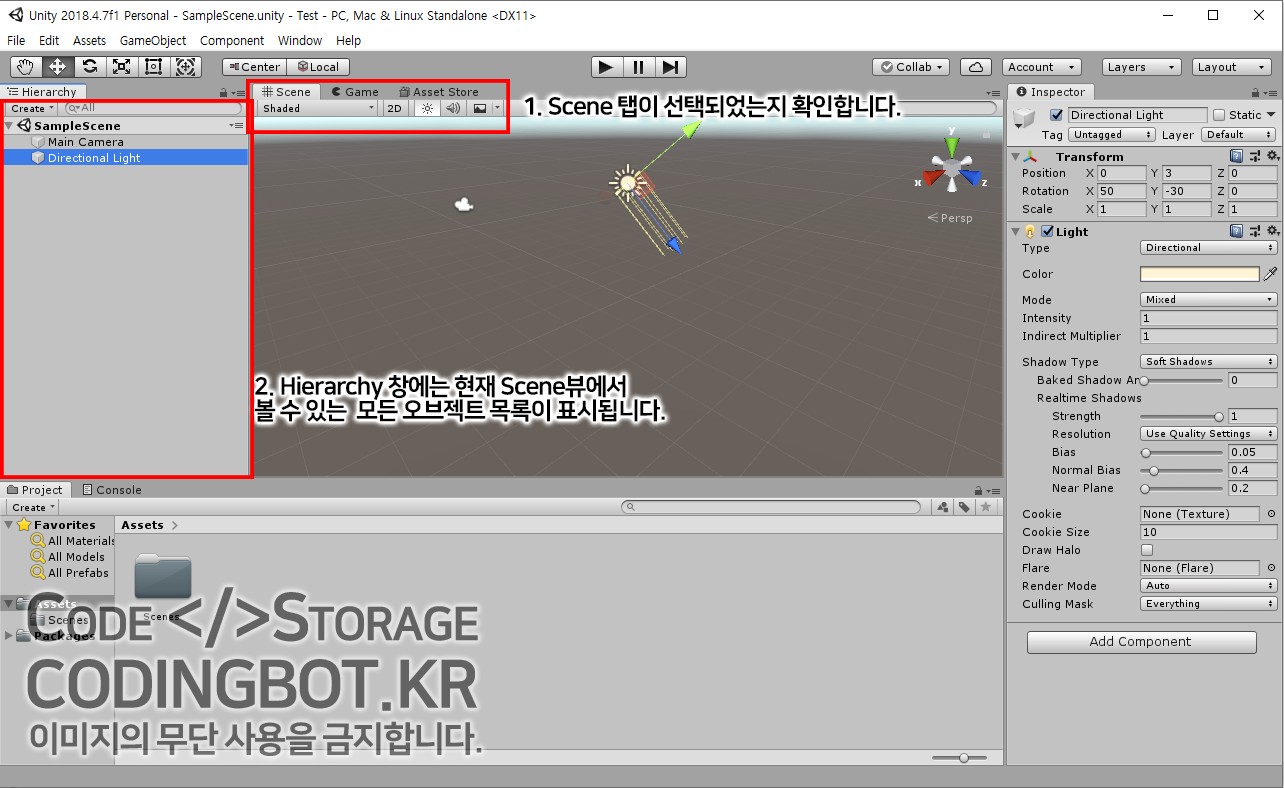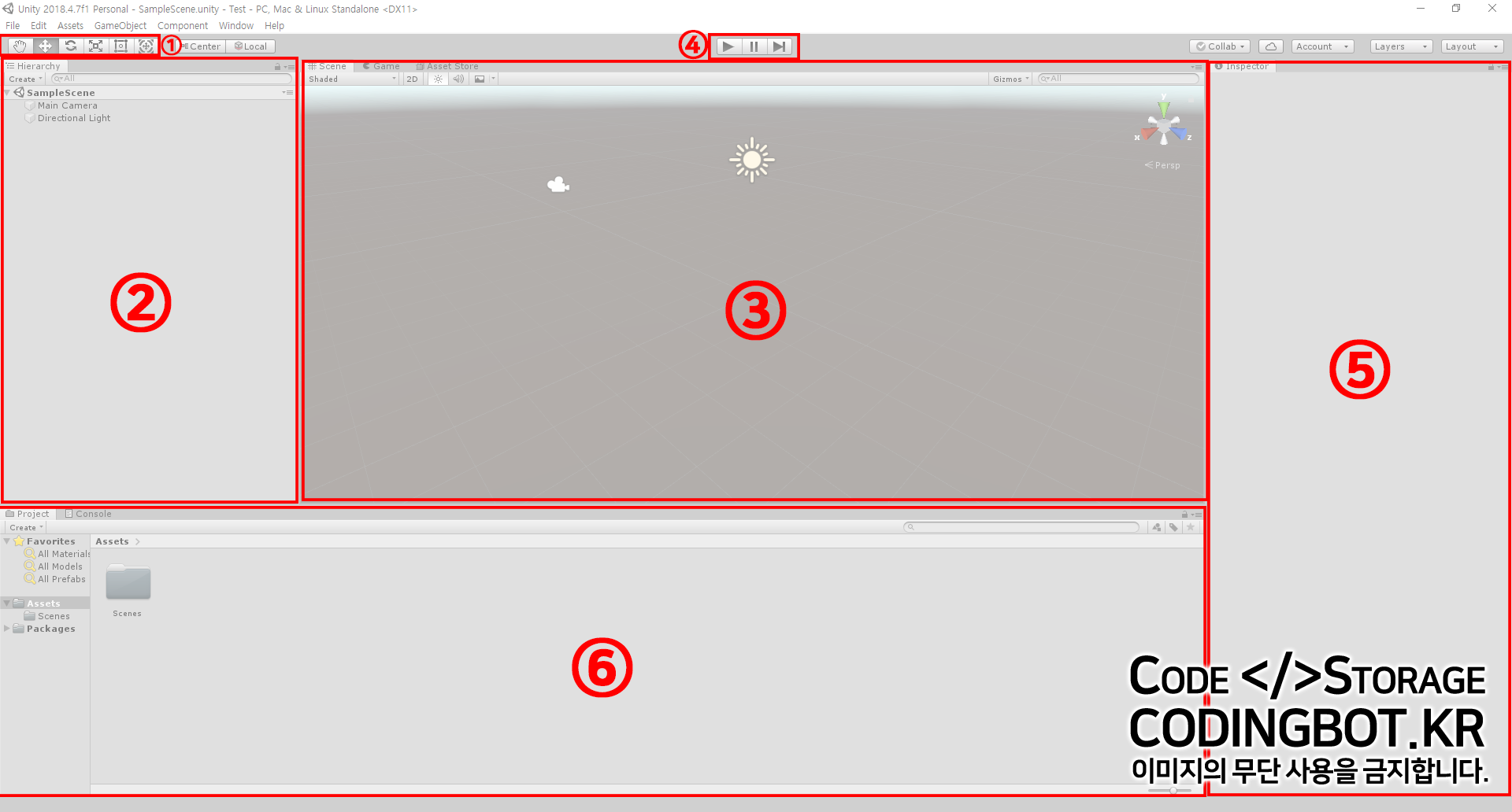 (3-1 : Scene 뷰) - 게임을 구성하는 메인 화면으로 이곳에서 리소스를 배치하여 게임 장면을 작성합니다. 왼쪽 위 탭을 이용해 게임 뷰로 전환할 수 있습니다.