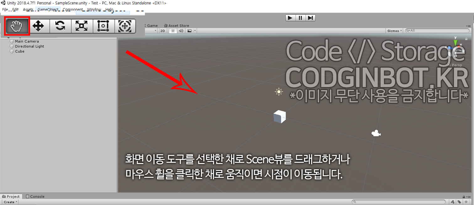Scene뷰의 시점을 조작하는 방법을 알아보겠습니다. Scene뷰에서 움직이는 시점은 개발자가 바라보는 시점으로, 게임을 실행했을 때 바라보는 시점과는 다른 시점입니다. 게임의 시점을 결정하는 것은 Camera 오브젝트 입니다.