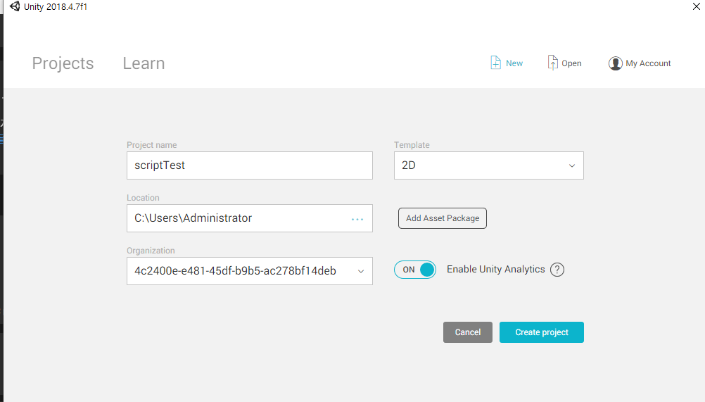 먼저 스크립트를 작성하고 테스트를 하기 위한 새로운 프로젝트를 만들겠습니다. 프로젝트 이름은 scriptTest, Template는 2D로 선택합니다.