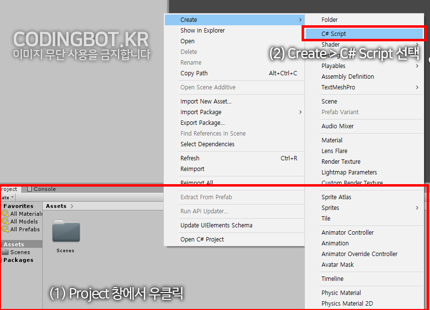 프로젝트를 생성하고 유니티 에디터가 실행되면 아래 그림과 같이 간단한 스크립트를 생성합니다.