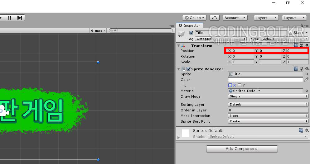 타이틀이 화면의 정 가운데에 오도록 위치를 조절하겠습니다. 계층구조 창에서 title을 선택하고 Inspector 창의 Transform 항목의 position을 0, 0, 0 으로 설정합니다.