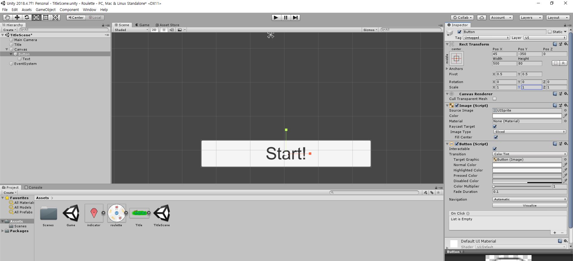 우선 시작 화면부터 오브젝트를 배치해보겠습니다. 프로젝트 창에 추가해 둔 roulette 이미지를 Scene뷰로 드래그&드롭합니다.
