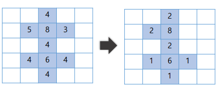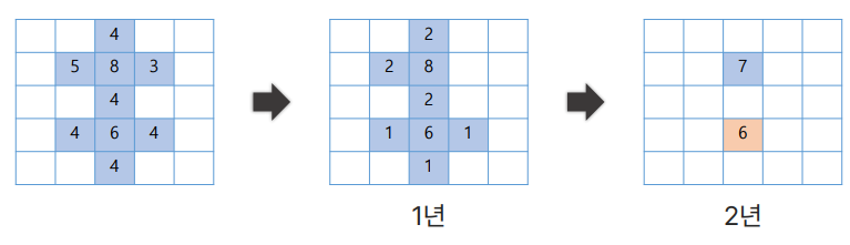 한 해가 지날 때 마다 빙산이 녹는 양은 인접한 바다 타일의 개수다. 이를 인접하지 않은 두 빙산으로 쪼개질 때 까지 걸린 햇수(위 상황에선 2가 정답)을 출력하는 것이 이 문제의 요구사항이다. 만약 빙산이 완전히 녹아 없어질 때 까지 쪼개지지 않았다면(빙산이 1조각인 상태를 유지했다면) 0을 출력한다. 인접의 기준은 상, 하 , 좌, 우 만 해당된다.